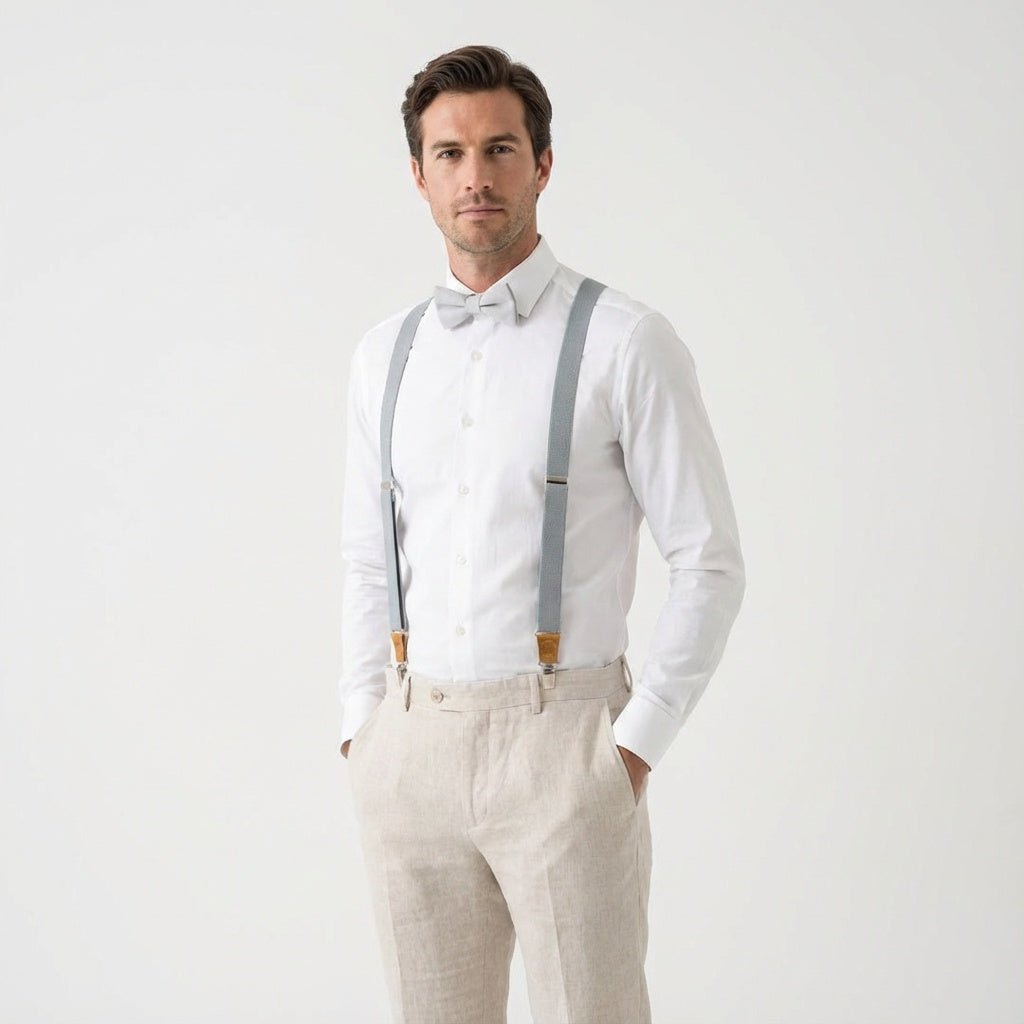 Bretelles élastiques grises et nœud papillon en lin | Tailles adultes