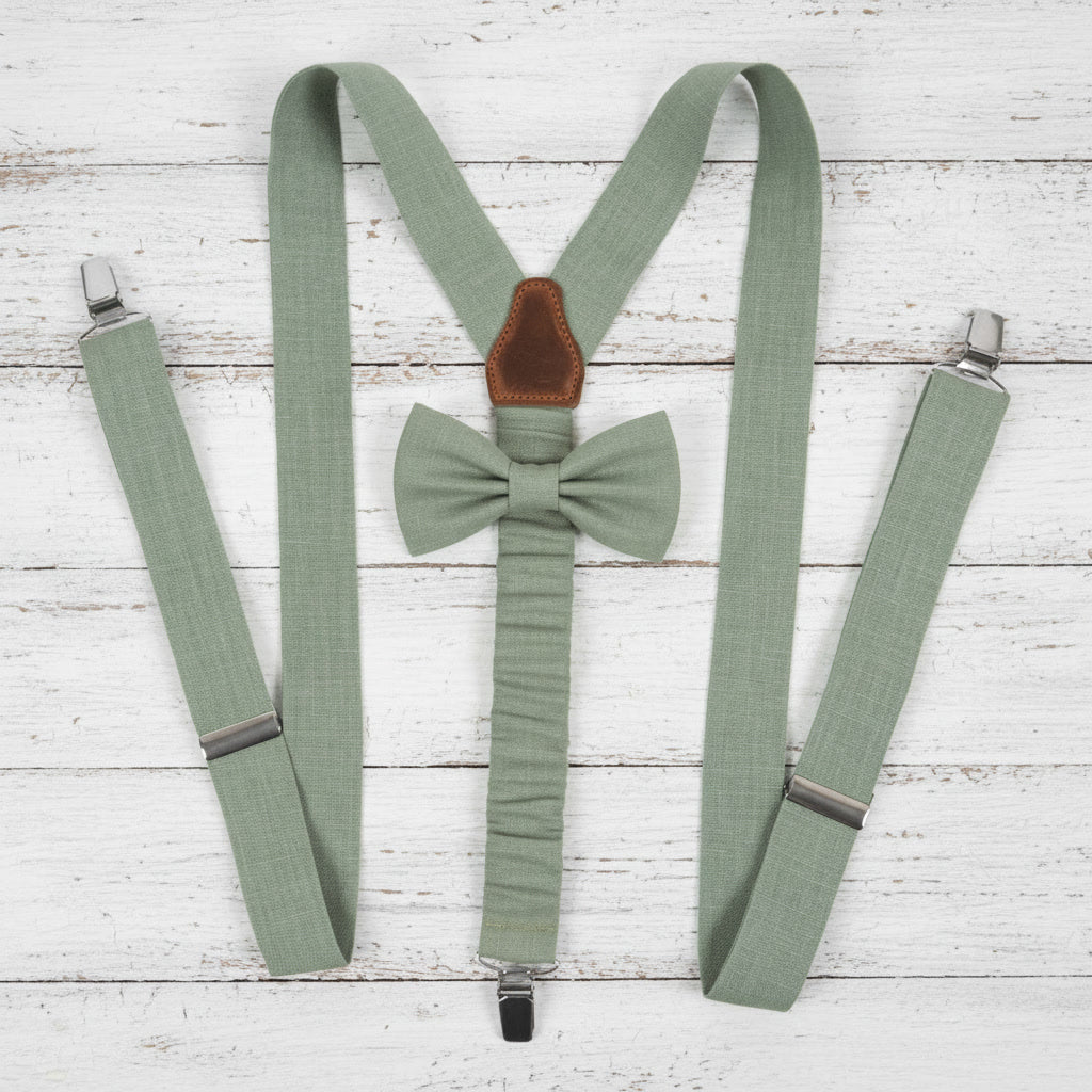Sage Green Suspenders & Linen Bow Tie Set | 9 Sizes (Age 1–Adult)