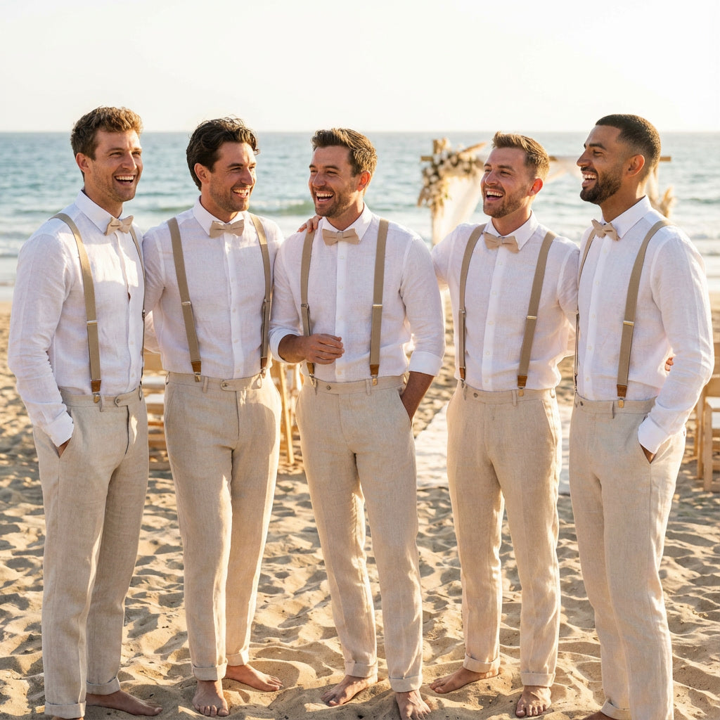 Beige Elastic Slim Suspenders & Linen Bow Tie Set | Wedding Style