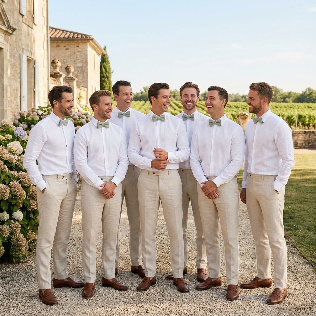 Achieve the sought-after "self-tied" look without the frustration. Our Light Sage Green Linen Butterfly bow tie is expertly pre-tied but designed with intentional, non-symmetrical variations. These subtle rustic "imperfections" give the tie an artisanal character, making it look like you tied it yourself for a perfectly relaxed yet formal finish.